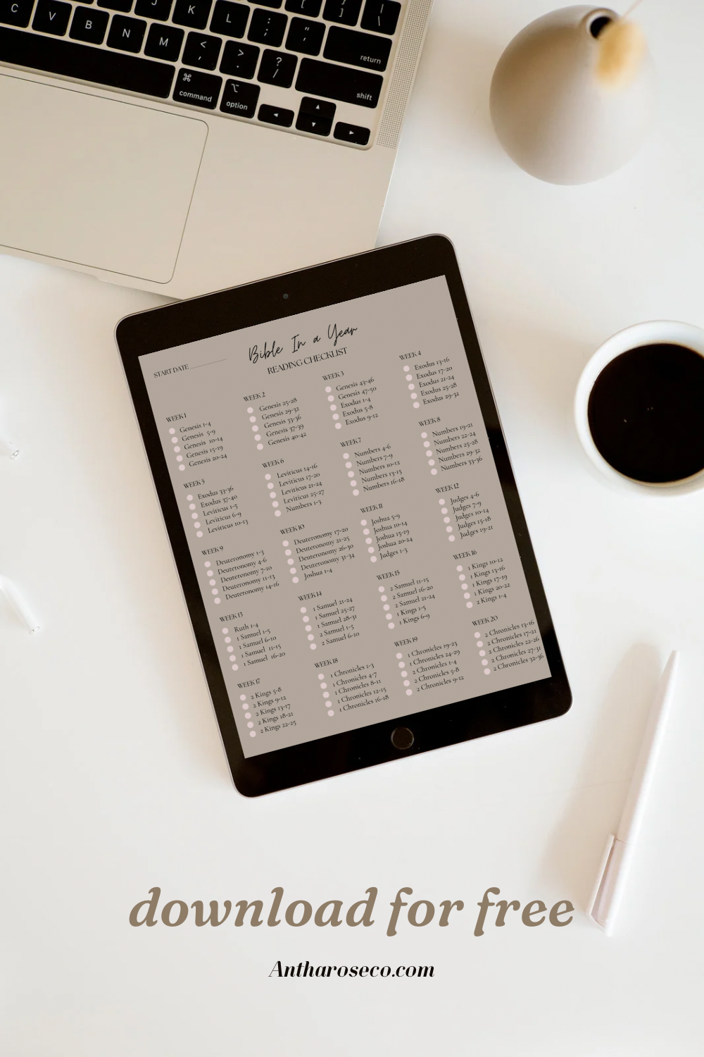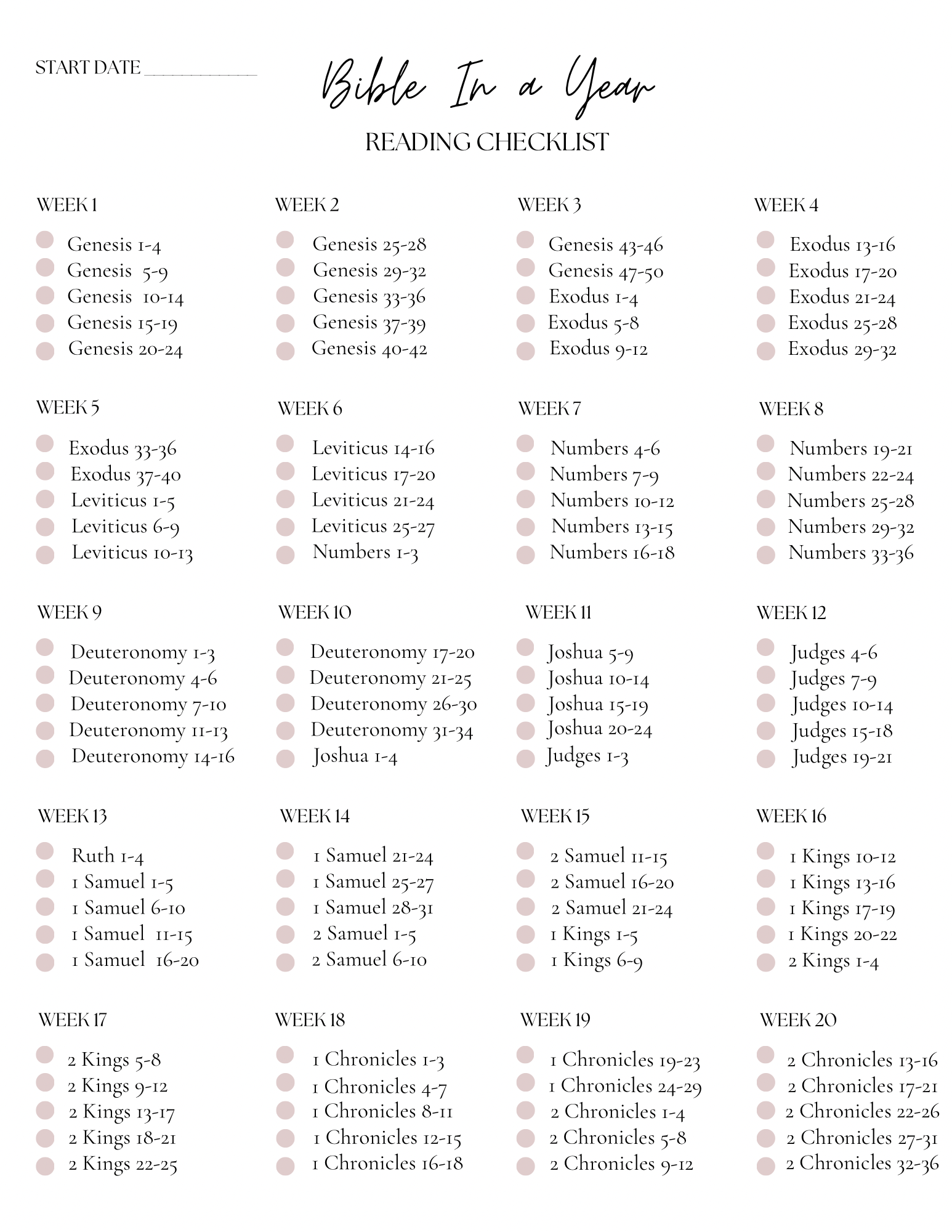 This is a 52 week plan broken down by reading 5 days a week which makes it really doable!